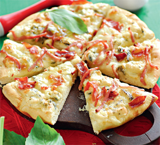 Пицца с моцареллой, горгонзолой и ветчиной